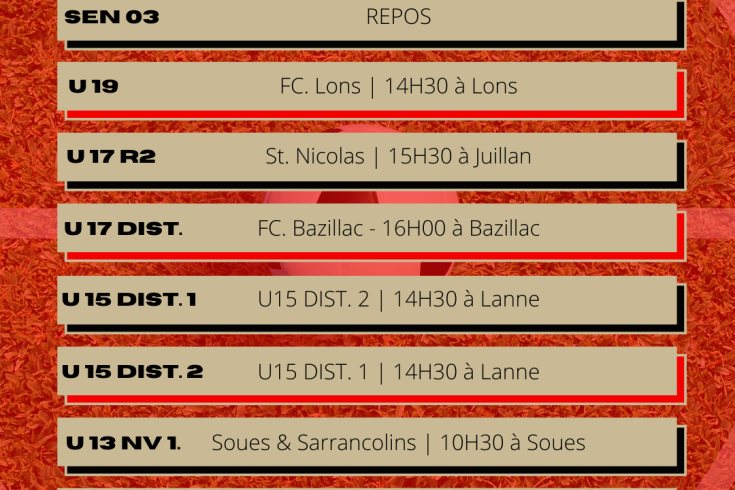 [CLUB] Le planning du week-end - Semaine 05 BARBOSA Quentin Mardi 1 février 2022 Retrouvez le planning de ce cinquième week-end de l'année 2022. Nous vous donnons rendez-vous ce week-end au bord des terrains. ? Port du masque obligatoire dans toutes les enceintes sportives. ❌Les buvettes seront fermées. Album photo